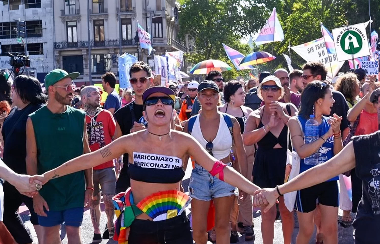 “Abanicos y bombos, ¿están listos? este es su momento”. Para las 15:30 Avenida de Mayo y San Jose ya estaba copada. Era el punto de partida al que convocó la Asamblea Antifascista LGTBIQ+ que nació luego de los dichos del presidente Javier Milei en Davos. Encabezaban las columnas de las organizaciones del movimiento acompañados por los camiones que suelen estar en sus marchas. “Memoria” decía la bandera más grande. “No pasarán”, advertía otra tela verde que resaltaba entre los miles de reclamos que se acumulaban en el lateral. “Las calles son nuestras y nuestra lucha es una fiesta”.